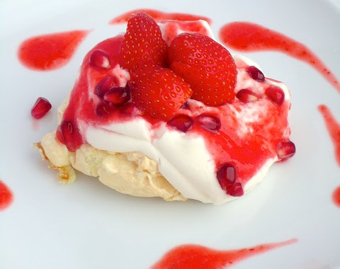 Klop de slagroom lobbig met 2 el suiker en verdeel dit over de merinques. Maak het geheel af met de aardbeien en de granaatappelpitjes. Verdeel tenslotte aardbeiensaus rondom het dessert.