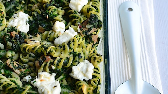 Doe de pasta in een ovenschaal en garneer deze met de resterende geitenkaas. Plaats de pasta ovenschotel met spinazie voor ongeveer 15 minuten in de oven totdat alle kaas gesmolten is.