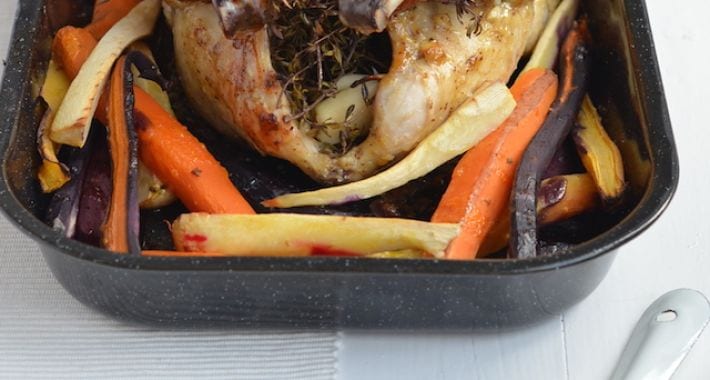 Serveer de hele kip uit de oven met de geroosterde groentes.