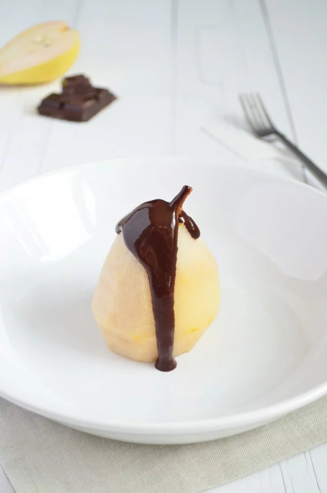 Serveer de gepocheerde peren met de warme chocoladesaus.