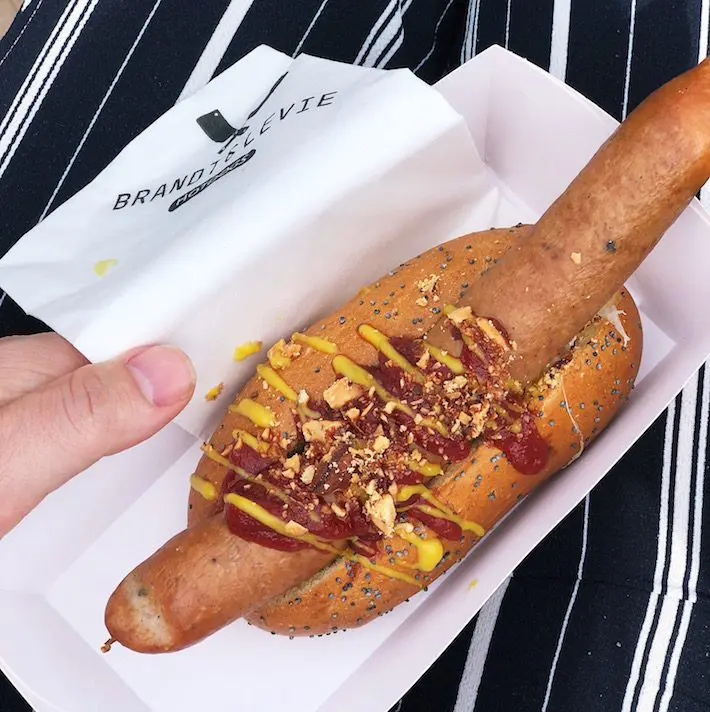 Maurits en ik deden mee met een perstour. Superleuk want we mochten het terrein op voordat het open was voor publiek. Bij Gulpener proefden we een speciaal biertje dat bevroren is geweest in combinatie met deze op appel- en eikenhout gerookte hotdog van Brandt en Levie. Superlekker!