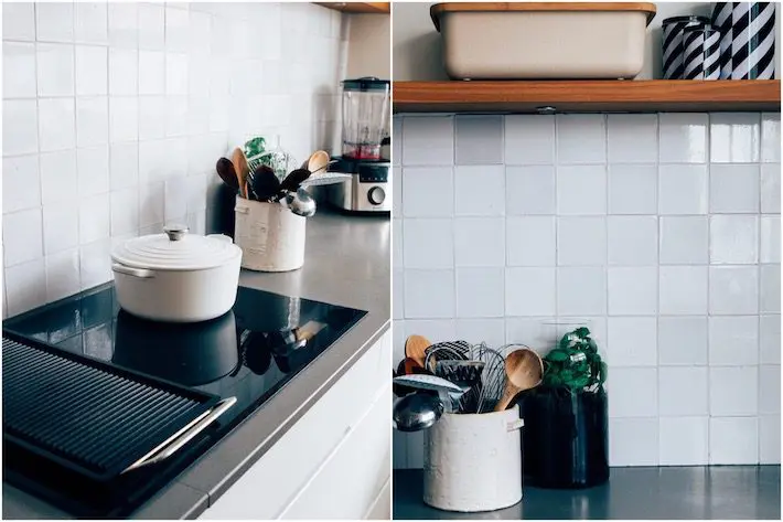 Allereerst een before foto! Er zijn eigenlijk 2 grote dingen veranderd, er is een wandje geplaatst voor de keuken (naast de keukenmachine). Dit zorgt ervoor dat de keuken iets meer afgesloten is. Superfijn, want mijn keuken is altijd vrij rommelig en dat zie je nu minder goed vanaf de bank. Het tweede grote ding is dat de wand achter het aanrechtblad is betegeld met Marokkaanse tegeltjes (Zelliges Blanc). Het was eerst geverfd met afneembare verf en dat werkte prima. Ik kon de muur heel goed schoonhouden, ook omdat ik hem direct na het koken afnam met een nat doekje. Maar deze tegels maken het nog makkelijker, plus ze geven de keuken een hele andere uitstraling. Wat minder standaard, maar toch rustig en daar hou ik van.