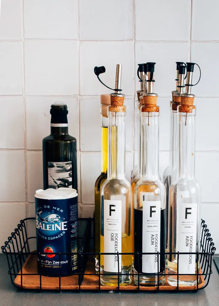 Mijn olie en azijn staan in een rekje. Ook dit plekje heb ik al 100 x veranderd. Van gewoon op het aanrecht, tot in een houten kistje, tot op een betonnen plateau. Voor nu ben ik wel even blij met dit mandje. Aan de andere kant van de kookplaat staat een grote pot met keukengerei. Hier hing eerst een rekje aan de wand, maar ik vond dit toch wel rommelig worden.