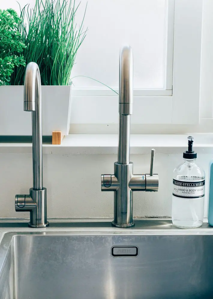 Annika heeft ze al een tijdje in haar keuken en nu heb ik ook eindelijk een Grohe Red en een Grohe Blue Home in mijn keuken. En daar ben ik echt heel blij mee. De Grohe Red is een kokend waterkraan en deze is eigenlijk onmisbaar als je veel kookt. Misschien ken je de “30 minutes” programma’s van Jamie Oliver waarin hij recepten kookt binnen 30 minuten. Hij begint altijd met het aanzetten van de waterkoker, omdat dit gewoon tijd bespaart in je keuken. Met de kokend waterkraan heb je helemaal geen waterkoker nodig. Je tapt het gekookte water zo uit de kraan. Ideaal voor het bereiden van pasta, koken van groente maar ook voor het steriliseren van speentjes en flessen of om een snel een kopje thee te zetten. Extra fijn aan deze kraan is dat hij niet spettert, dat is wel zo veilig. En er zit een kinderbeveiliging op. Je hoeft dus echt niet bang te zijn dat je ineens je handen wast onder kokend water of dat je kind dit zo maar aan kan zetten. Met Merlijn in huis vind ik dit een hele fijne gedachte.