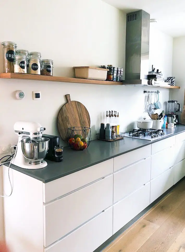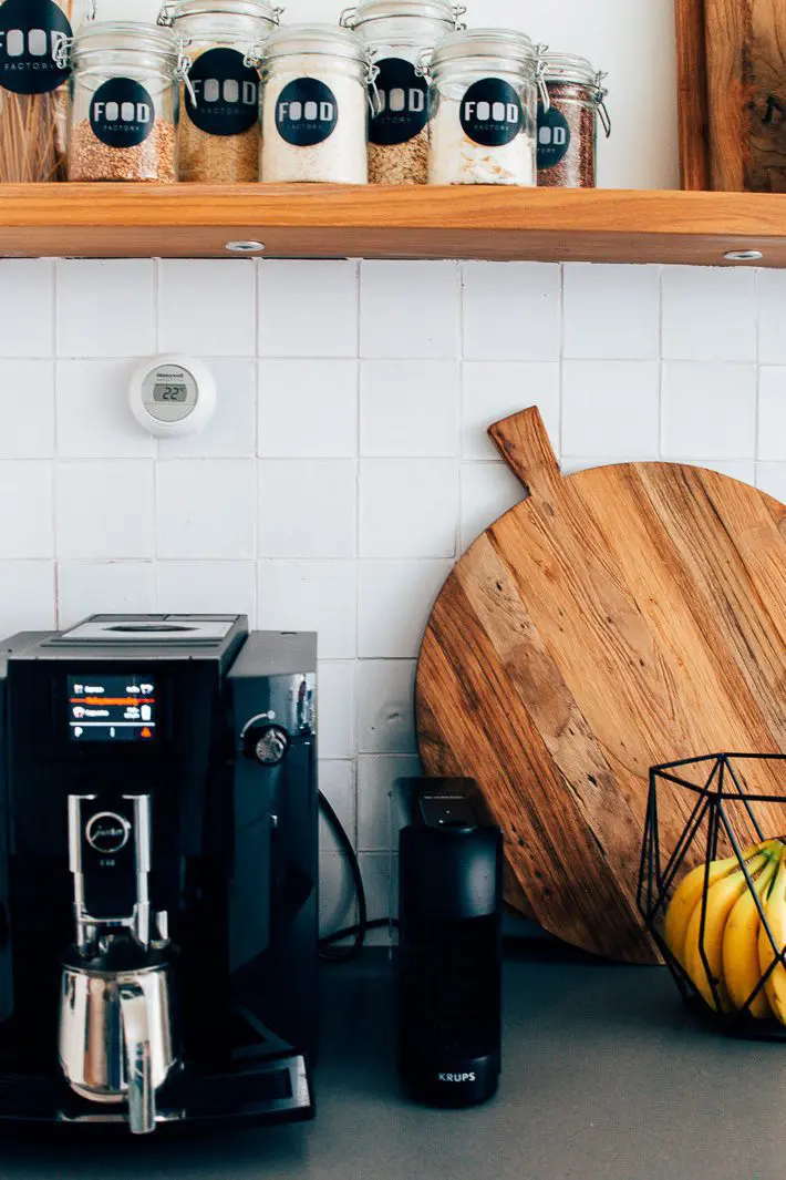 En daarmee heb ik ook gelijk de indeling iets veranderd. Mijn koffieapparaten staan nu direct links wanneer je de keuken binnenstapt. Superhandig want in de la liggen de cupjes en op de plank staan de bonen. Ik heb de indeling van de plank ook iets veranderd. Ik ben daar nog een beetje mee aan het spelen hoe ik dit het mooiste kan aankleden. Ik heb nu gekozen voor een aantal grotere elementen, omdat je deze makkelijk schoon kunt houden.