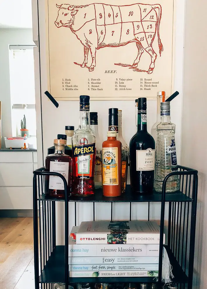 Voor wie mij langer volgt, weet dat ik 4 planken in de woonkamer had, die volstonden met kookboeken. Heel mooi, maar ook een beetje rommelig en een stofnest. Dit moest dus anders. De planken zijn weg, maar een foodie zonder kookboeken kan natuurlijk niet. De mooiste titels heb ik beneden neergelegd. Een paar in dit drankenkarretje en ook een paar in de buffetkast. De rest van de boeken is naar boven gegaan en een deel naar de kringloop.