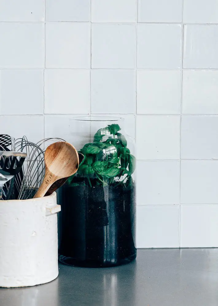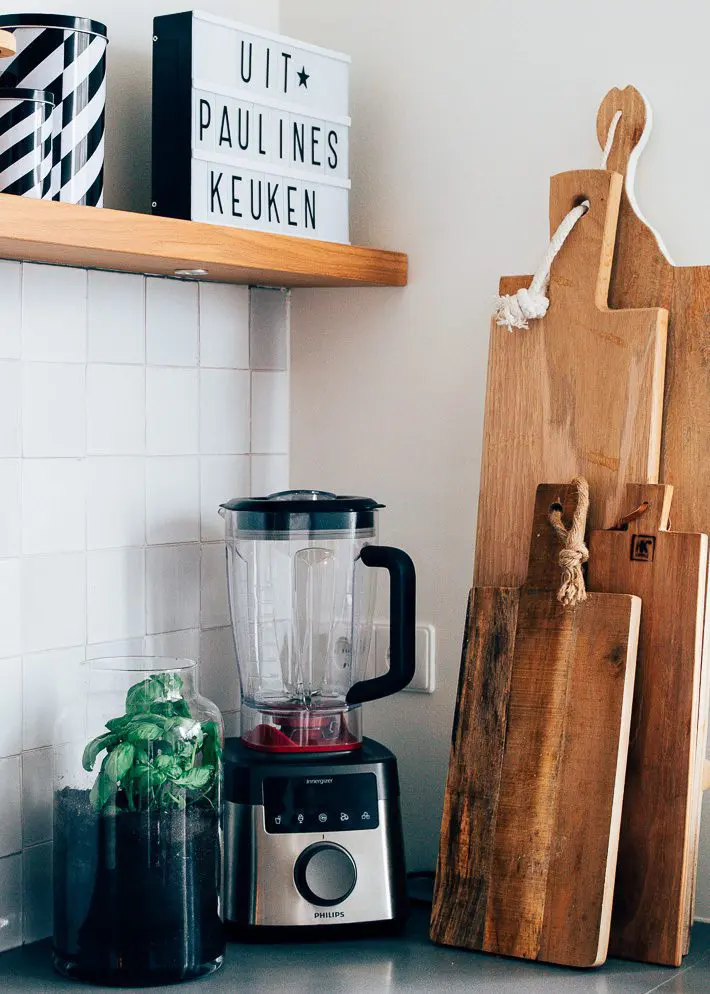 Ik ben overgestapt van gas naar inductie en mijn kookplaat is dus vervangen. Rechts in mijn keuken heb ik grote serveerplanken staan. Die gebruik ik voor goed belegde borrelplanken tijdens feestjes. De basilicum in pot is een experiment van Maurits, het is zijn doel om weer een hele grote plant te kweken.