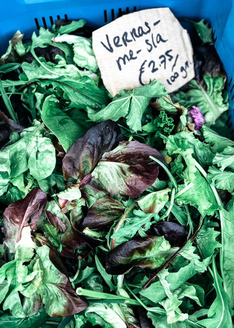 Veldsla heeft kleine, zachte blaadjes. De smaak is mild nootachtig en past goed bij een dressing van honing en mosterd. En weet je wat zo fijn is aan veldsla? Je kunt het met wortel en al eten!