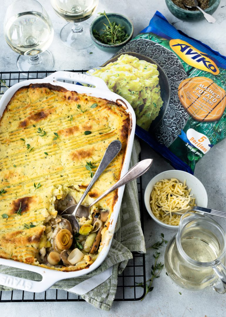 Roer de prei, ui en champignons door de bechamelsaus en schep alles over in een ovenschaal. Verdeel de aardappelpuree er overheen en maak met de achterkant van een vork er een mooi patroontje in. Zet de ovenschaal 20 minuten in de oven, zet de laatste 5-7 minuten de grill van de oven aan zodat de bovenkant mooi goudbruin kleurt. Bestrooi eventueel met wat extra blaadjes tijm.