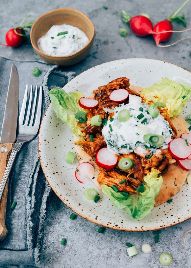 Beleg een flatbread met een paar blaadjes sla. Leg hierop de pulled chicken. Garneer met wat fijngesneden lente ui en plakjes radijs. Verdeel een lepel van de yoghurtsaus over de kip en serveer meteen.