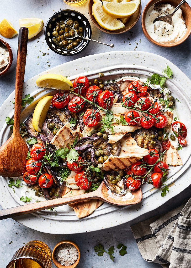 Gegrilde aubergine, sappige tomaten en krokant platbrood, lekker met een romige feta-yoghurtdip met een frisse twist van citroen. Dit is het soort salade dat alles heeft: warm, koud, romig, kruidig én knapperig. Wij maken ‘m graag als lunch op een zomerse dag of als bijgerecht bij een etentje.
