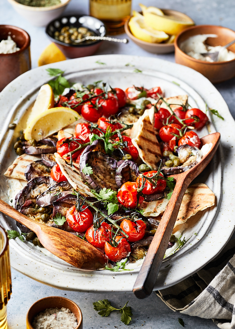 Leg de gegrilde aubergine, tomaten en stukken platbrood op de feta-yoghurtdip. Bestrooi de aubergine salade met kappertjes, koriander en dille.