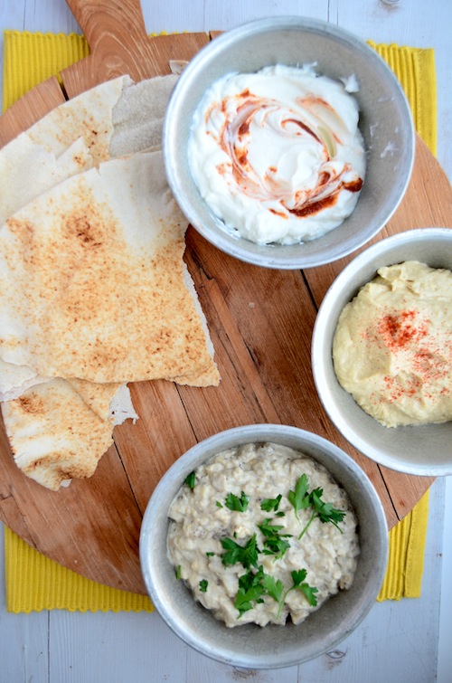 Op de foto zie je naast de baba ganoush ook nog hummus en pikante yoghurt dat bestaat uit Turkse yoghurt met een lepel Harissa erdoor.