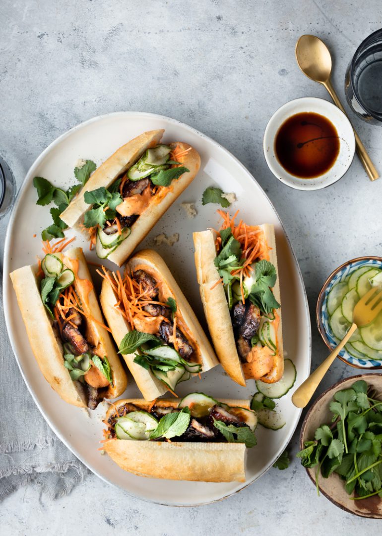 Besmeer de onderste helft van de stokbroodjes met de Sriracha mayonaise. Snijd de speklapjes in kleinere stukjes, en leg ze op de mayonaise, leg de zoetzure komkommer en julienne wortel er tussen, garneer met verse kruiden en leg de bovenste helft van de stokbroodjes er op.