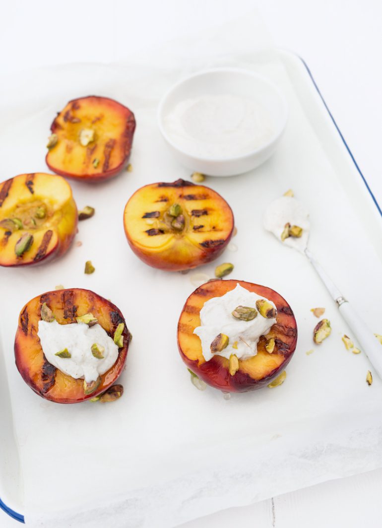 Serveer de perziken van de bbq met een lepel Griekse yoghurt. Garneer ze met een lekkere drizzle honing en wat fijngehakte pistachenootjes.