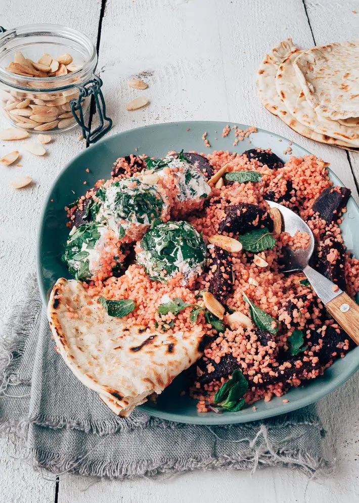 De bietencouscous zelf is gemakkelijk om te maken. Een in de pan gefruit uitje en knoflook voeg je bij de couscous, wat bietensap en bouillon er bij, deksel op het bakje en dan een kwartiertje wachten tot dat de couscous al het vocht heeft opgezogen. Beetje zoals gebruikelijk. De gekookte bietjes snijd je in parten en meng je door de couscous. Serveer met de labneh balletjes en geroosterde amandelen.