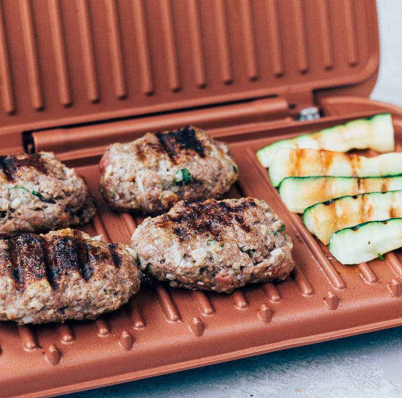 Bak de bifteki op de grill (of in een grillpan) in ongeveer 10 minuten goudbruin. Leg er meteen ook wat courgette (of paprika of aubergine) naast en grill dit mee.