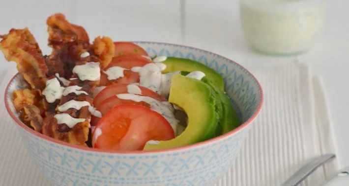 Leg de baconstrips erbij en maak de BLT bowl af met een flinke drizzle Ranch dressing.