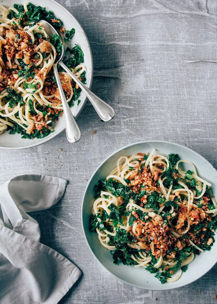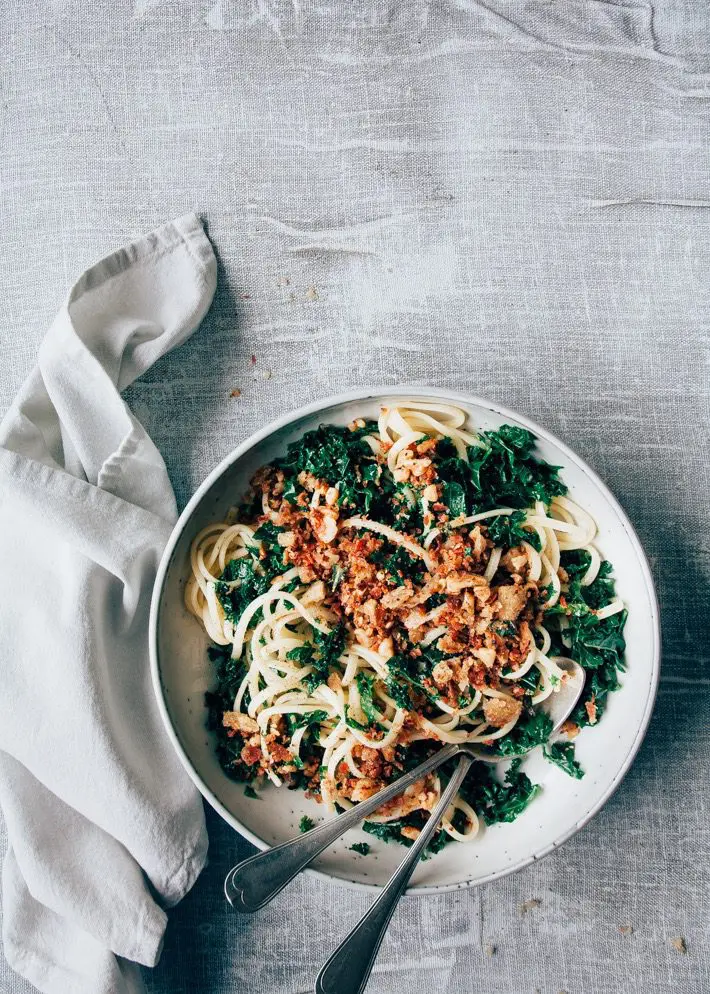 Het is stiekem heel erg Italiaans om een broodkruim als een topping voor een pasta gerecht te gebruiken. Het wordt ook wel Parmezaanse kaas voor de armen genoemd en in het Italiaans pangrattato. Gemalen brood. Wanneer je heel snel kijkt lijkt het op Parmezaanse kaas. Moet je wel snel kijken! Dus snel aan de slag, tagliatelle koken, boerenkool roerbakken en broodkruim maken. Eet smakelijk.