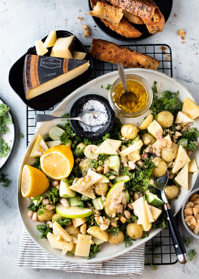 Het is een lauwwarme salade met krieltjes, romige kaas, plakjes frisse appel en snelle roergebakken boerenkool. Je brengt de salade extra op smaak met een gemakkelijke dressing van olijfolie, citroen, fijngehakt sjalotje en citroensap. Serveer deze maaltijdsalade met vers brood of maak er net als in het recept van die te lekkere knapperige goudbruin gebakken broodsoldaatjes bij. Je maakt deze vega salade in 30 minuten!