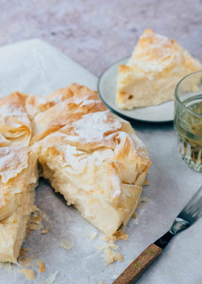 Griekse bougatsa is een heerlijk gebakje met custard. In Griekenland eten ze het vaak als nagerecht of bij de koffie. Je kunt het bij iedere bakker op de hoek van de straat kopen. Het is het beste te vergelijken met een tompouce. Bougatsa wordt gemaakt van filodeeg. Dit is heel dun deeg wat je kunt kopen bij de Turkse supermarkt. We raden je aan om vers filodeeg te gebruiken in plaats van diepvries filodeeg. Dit is net wat makkelijker om mee te werken. De diepvries variant scheurt namelijk sneller. De vulling van dit Griekse bougatsa recept bestaat uit custard. De combinatie van de lekker zoete custard en het knapperige filodeeg is heerlijk. Dit Griekse dessert is zeker het proberen waard.