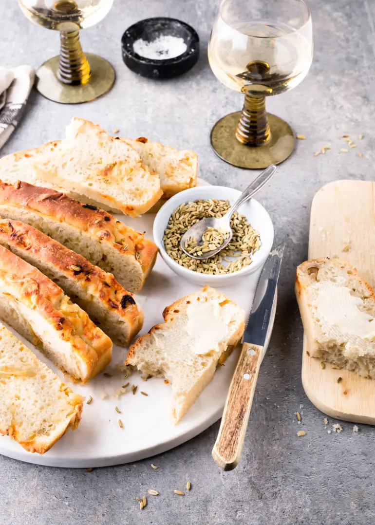 Haal het deeg uit de mengkom. Rol het, op een met bloem licht bestoven werkvlak, uit tot een rechthoek van ongeveer 3-4 millimeter dik. Verdeel de uiringen er over en bestrooi met de geraspte kaas en het venkelzaad. Vouw het deeg dicht, zodat de vulling er niet uit kan en rol uit tot rechthoek van 20 x 30 centimeter.