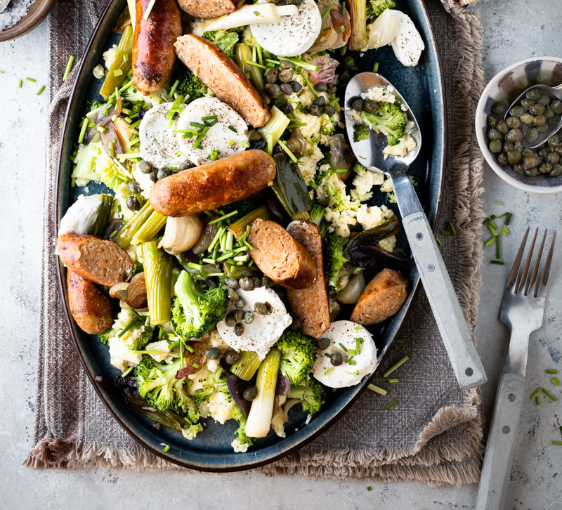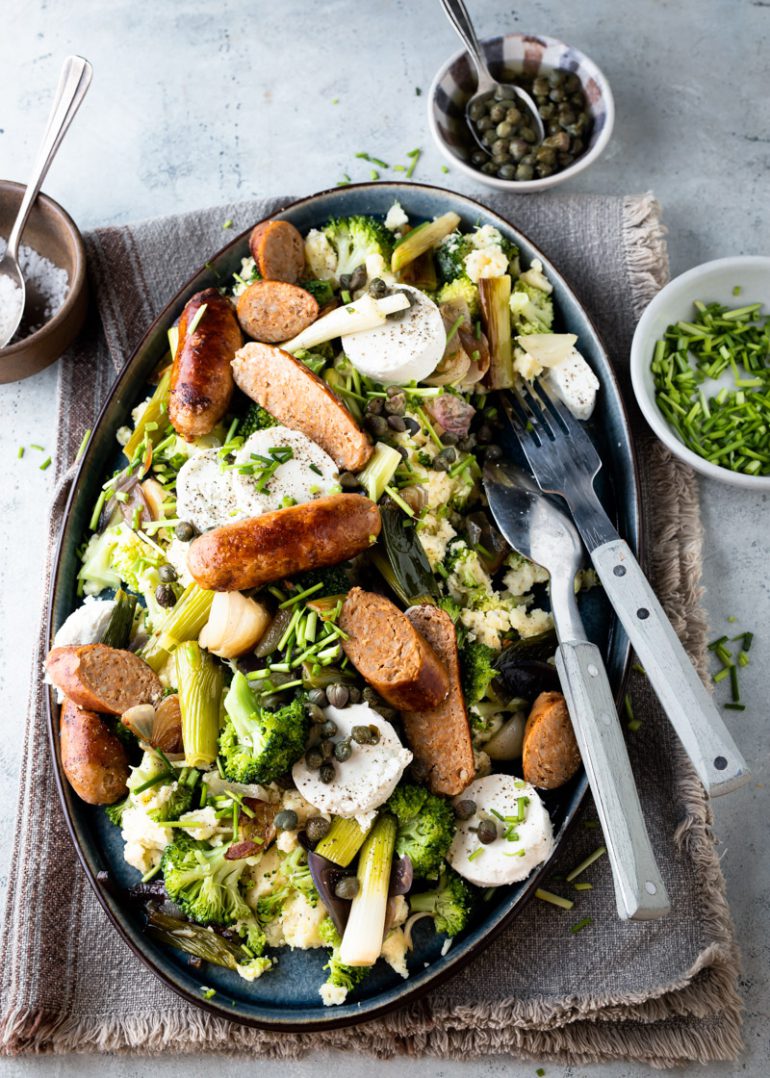 Giet de aardappels af en stamp ze met de mascarpone en geitenkaas glad en romig. Breng op smaak met peper en zout. Schep de broccoliroosjes, sjalot en bosui er door en geef de worstjes erbij. Hak de bieslook fijn en strooi over de stamp, garneer met kappertjes en nog wat extra geitenkaas.