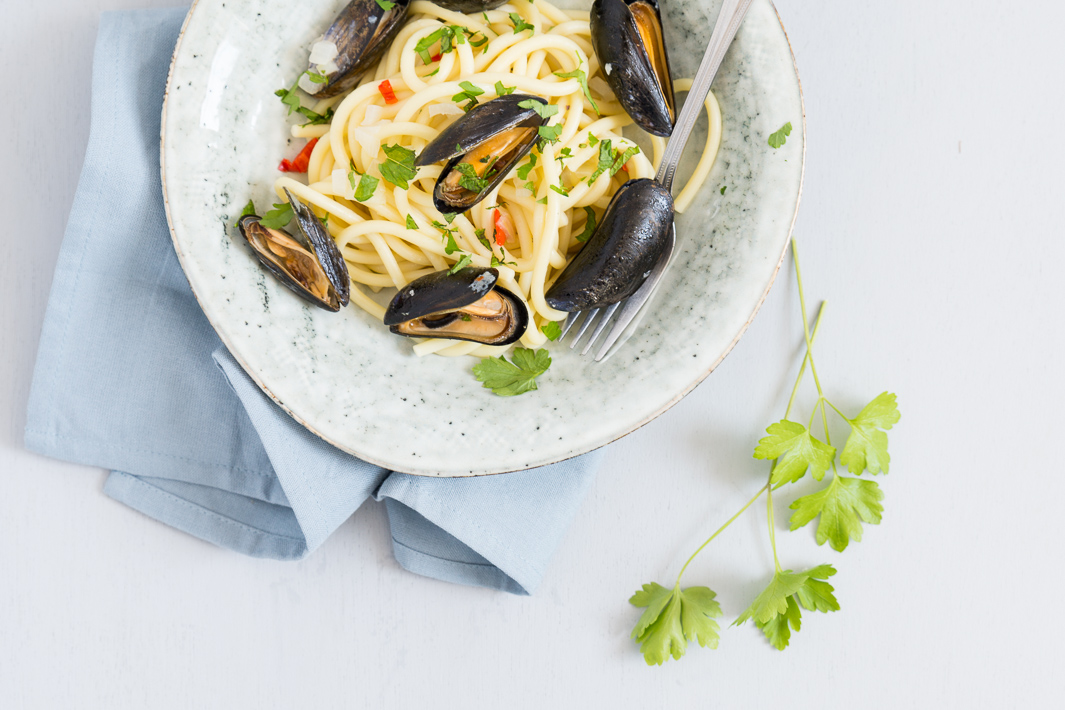 Garneer de pasta met mosselen met een flinke hand peterselie.