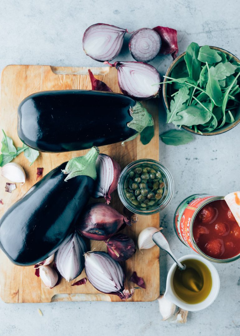 Hier kun je ons echt voor wakker maken! Caponata met burrata! Heerlijk met een stuk knapperig brood.. Nog nooit van caponata gehoord? Het is een Siciliaanse gerecht van gekookte groenten met als belangrijkste ingrediënt aubergine. Caponata heeft alles in zich om vlees in een vegetarisch gerecht te vergeten. Dat komt omdat het vol zit met hartige smaakmakers: de zacht maar bruin gebakken aubergines, de zoete tomaatjes (wij gebruiken graag de pomodorini tomaatjes uit blik omdat je in een handomdraai een lekkere zoete en dikke saus hebt), zoute kappertjes, de rode wijnazijn en de heerlijk romige burrata. Deze caponata heeft als extra smaakmakers honing en venkelzaad. Je kan het zowel warm als koud eten en ook heel goed een dag van te voren maken en opnieuw opwarmen. Een caponata doet het bijvoorbeeld ook heel goed als een anti-pasti bij een Italiaans etentje. Garneer de caponata voor het serveren met een flinke hand rucola, een drizzle olijfolie en verse kruiden!