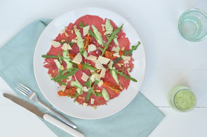 Met deze carpaccio geniet je van de Italiaanse smaken met een twist! Wij geven aan dit recept namelijk een draai met een lekkere basilicum-mayo. Een aanrader is om als voorgerecht deze carpaccio te serveren tijdens een gezellig diner met vrienden en familie. Maar de beef carpaccio is ook geschikt als een lichte lunch op een zonnige middag. Of maak hem als een salade.