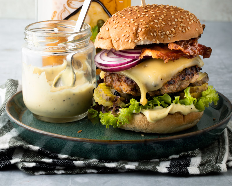 Zin in een cheeseburger? Deze maak je heel gemakkelijk zelf met dit eenvoudige cheeseburger recept. Met een lekkere flinke klodder truffelmayonaise en extra knapperige plakjes uitgebakken spek is dit een echte deluxe burger. Om de cheeseburger zelf extra smaak te geven meng je een fijngesneden rode ui en wat mosterd door het gehakt.