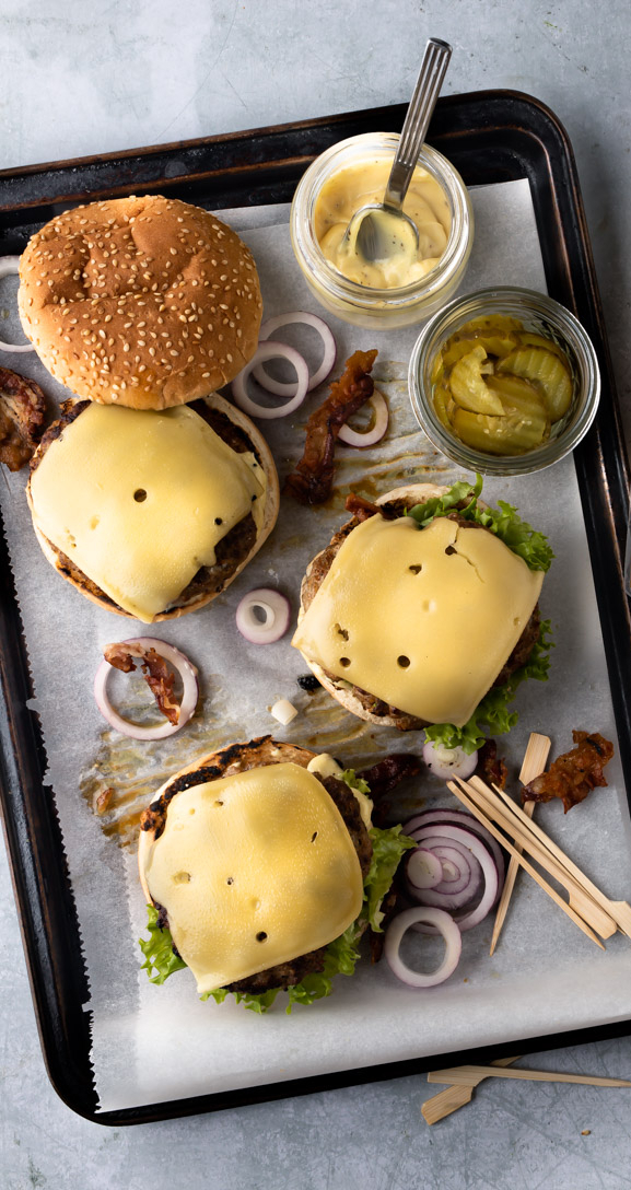 Wist je dat je ook heel gemakkelijk een cheeseburger op de bbq kunt maken? Bak de burgers eerst op het rooster, leg de plakjes raclette-kaas er op en sluit dan de deksel van je bbq. In de pan doe je ongeveer hetzelfde. Je bakt de burgers rondom bruin in een koekenpan, legt de plakjes kaas er op en dekt daarna af met een deksel. Perfect gesmolten kaas! Garneer de cheeseburger verder met sla, rode uiringen en plakjes augurk.
