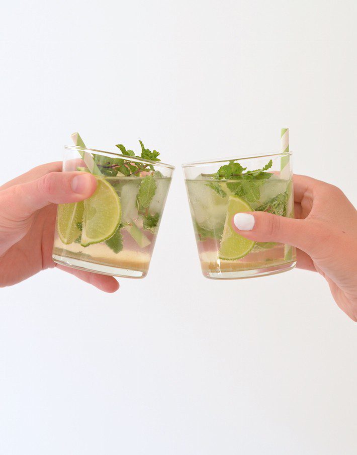 Garneer de mojito met de partjes limoen en de takjes munt. Serveer meteen!