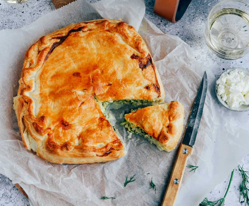Waar ze in Griekenland vaak filodeeg gebruiken als basis, gebruiken wij vers bladerdeeg. Dit is supermakkelijk om mee te werken en gewoon verkrijgbaar in de supermarkt. De courgette raspen we en daarna is het belangrijk dat je deze goed uit laat lekken. Anders wordt het bladerdeeg nat en dat wil je liever niet. De courgette quiche kan je eten als hoofdgerecht, maar evt. ook serveren bij de lunch. Dan neem je gewoon een wat kleiner puntje.
