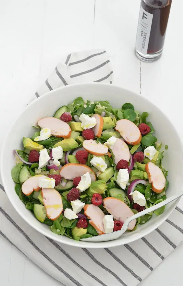 Als je deze frambozenazijn eenmaal geproefd hebt, wil je nooit meer anders. Hij is fris, fruitig en zoet tegelijk. Perfect in deze couscous salade met geitenkaas. Natuurlijk mogen de verse framboosjes niet ontbreken. Ik heb er ook nog gerookte kipfilet aan toegevoegd. Ik hou er van. Liever vega? Dan kun je dit uiteraard ook weglaten. Enne dit recept staat natuurlijk heel goed op de paastafel. Daar krijgt iedereen meteen dat instant lentegevoel van! Enjoy!