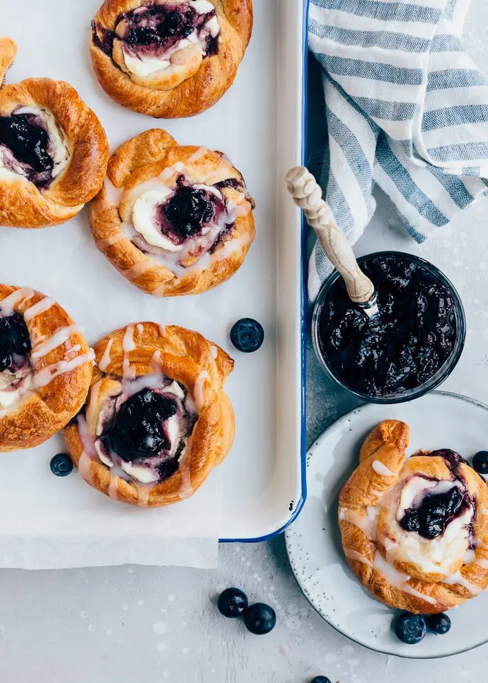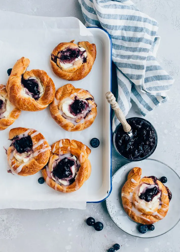 Maak een kuiltje in het midden van het Deense broodjes. Ik heb de achterkant van een lepel gebruikt, maar het kan ook met de vingers. Je kan het best een beetje diep maken, want het deeg veert nog terug. Meng de roomkaas met 1 el poedersuiker en verdeel dit over de kuiltjes. Verdeel over ieder broodje een klein theelepeltje bosbessenjam.