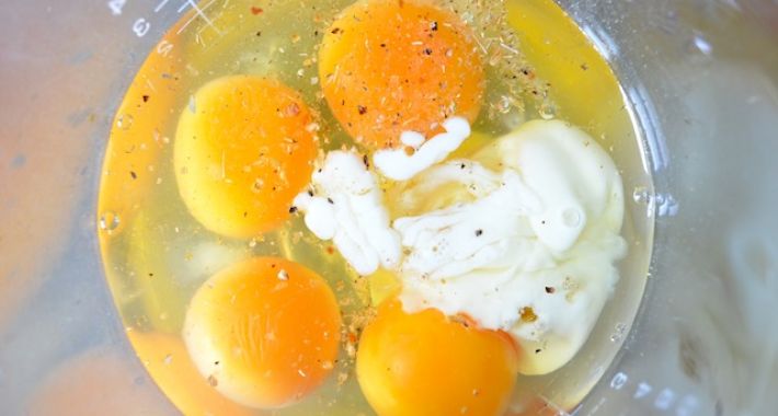 Klop de eieren luchtig met een scheutje room en breng dit op smaak met peper en zout. Wees hier niet zuinig mee.