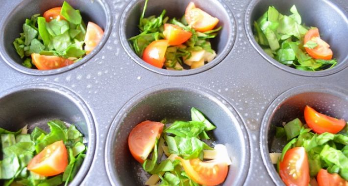 Verdeel het ei mengsel over de muffinvorm, vul ieder vormpje voor ongeveer 3/4 met ei. Bak de muffins in ongeveer 20 minuutjes af in de oven.