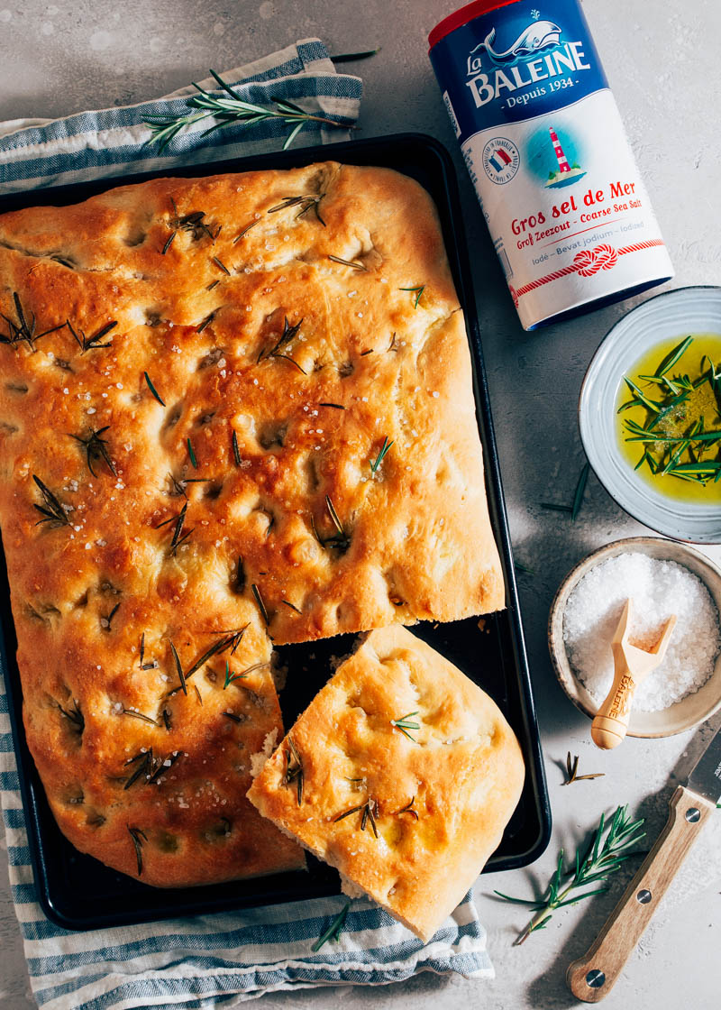 De finishing touch van deze focaccia genovese is een royale sprinkel grof zeezout en verse rozemarijn. In dit recept gebruiken we La Baleine zeezout: de fijne variant in het deeg, de grove eroverheen. Dit Franse zoutmerk staat bekend om zijn pure smaak en goede structuur. Het maakt echt het verschil, zeker bij zo’n simpel gerecht als deze focaccia genovese. Een aanrader als je een focaccia recept wil maken dat écht goed op smaak is.