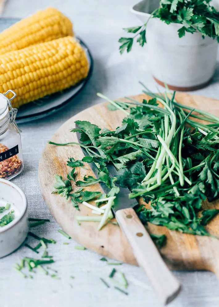 Als iets lekker is, is het gegrilde maïs en boter. De boter bestrijk je over de gegrilde maïs en dan smelt het lekker over die mais zodat de smaak van de boter ook in de maïs trekt. De boter geef je een extra smaakje door er chilivlokken, citroen en rode ui doorheen te prakken. Wanneer je de maïskolven hebt geroosterd bestrijk je ze met boter. Voor de salade snijd je de maïs er af, je mengt ze met uitgebakken spekjes en feta. Daarna overgiet je alles met een salsaverde. Ik gebruik voor dit recept (en ook voor de snelheid) de voorgekookte exemplaren. Die liggen geseald in de koeling. Verse (met het blad er nog omheen) moet je eerst zelf voorkoken. Wanneer je dit recept op de bbq maakt kun je ook de spek uitbakken op de bbq, gebruik dan spek lapjes die je in blokjes snijdt na het op de bbq bakken of plakjes spek.