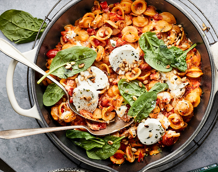 Vandaag delen we een heerlijk recept voor geitenkaas pasta met spinazie. Een eenpansgerecht om van te smullen! In dit gerecht serveren we orecchiette (‘oortjes’ pasta), tomaten en paprika met geitenkaas: een verrassend lekkere combinatie! En alles gaat dus in één grote hapjespan – scheelt jou weer afwas. Om het gerecht af te maken, voegen we een portie babyspinazie (of rucola) toe. Het resultaat is een verrukkelijke geitenkaas pasta waar het hele gezin van kan smullen – enne, deze one-pot-wonder staat in 30 minuten op tafel!