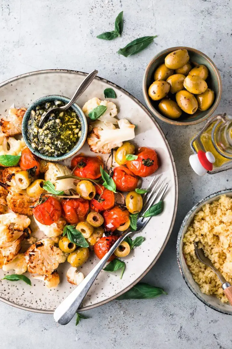 Halveer de olijven en haal de blaadjes basilicum van de takjes. Haal de geroosterde bloemkool uit de oven en verdeel ze over de borden. Leg op elk bord een takje tomaatjes. Schep er wat gele couscous bij en garneer met de olijven, basilicum. Lekker met een royale eetlepel pesto.