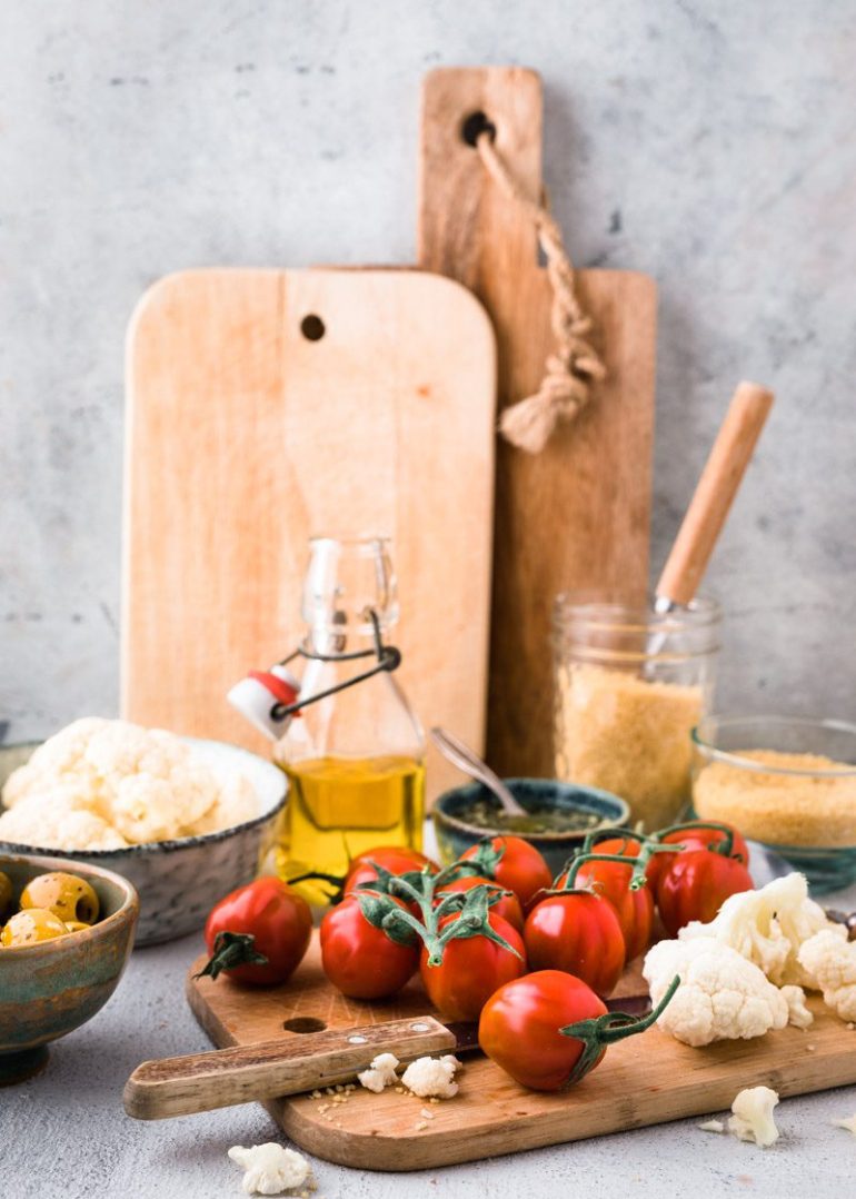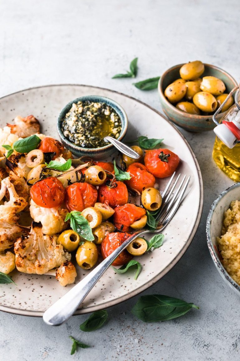 Vandaag een lekker vegetarisch recept van geroosterde bloemkool uit de oven met couscous en heel veel lekkere mediterrane smaken. De couscous hebben we een smaakje gegeven door het te wellen in kokend heet water en saffraan. Daar krijgt het niet alleen een mooie goudgele kleur van maar ook een bijzonder lekkere smaak. De geroosterde bloemkool maak je heel simpel door de bloemkoolroosjes in een kom met olijfolie en geperste knoflook te husselen (gewoon lekker met je handen) tot alle roosjes rondom bedekt zijn met olijfolie. Je kunt de bloemkool zelf in roosjes snijden of je koopt, wanneer je echt snel klaar wilt zijn, gewoon een zak met bloemkoolroosjes. Daarna stort je ze op een bakplaat en rooster je ze in de oven tot ze gaar zijn en bruin kleuren. Eet daarbij de saffraan couscous, geroosterde tomaatjes, olijven en pesto. Wij gebruikten in dit recept een kant-en-klare pesto, maar je kunt ook zelf heel snel een lekkere pesto maken. Kijk hier voor een homemade rucola pestorecept. Het maken van deze geroosterde bloemkool is zoals je leest zo gebeurd. Je kunt er ook nog een lekker knapperig brood bij eten, een platbrood of pita broodjes.