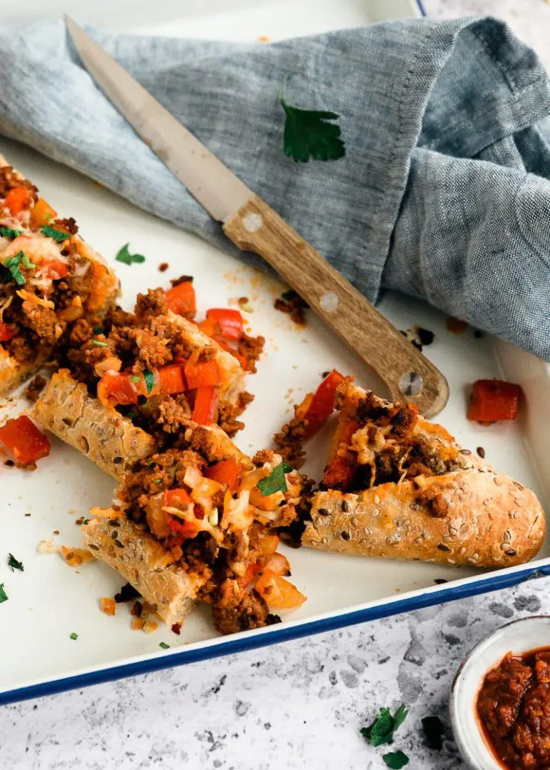 Wij zijn dol op dit soort weekendrecepten! Een gevuld stokbrood met gehakt is lekker bij de borrel maar kan ook prima als avondeten met een kom soep erbij. Het leuke is dat dit recept zo gemaakt is. Het is gewoon een kwestie van gehakt bakken, op smaak brengen (wij hebben het lekker pittig gemaakt), een stokbrood uithollen, vullen en hups de oven in. Lekker en simpel dus! PS dit is ook heel leuk om met Turks brood te maken.