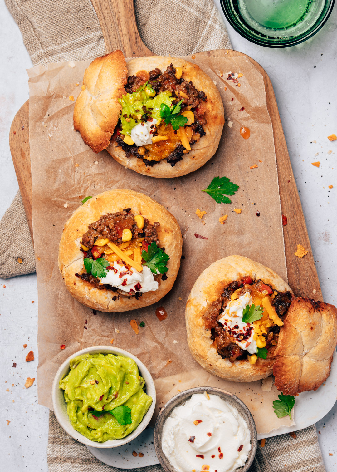 De krokante afbakbroodjes worden gevuld met een pittig gekruid gehaktmengsel, paprika en ui, en natuurlijk een flinke laag gesmolten kaas. Je zet deze gevulde broodjes in no-time op tafel en je kunt er eindeloos mee variëren. Perfect voor een drukke doordeweekse dag waarop je toch iets lekkers wil maken.