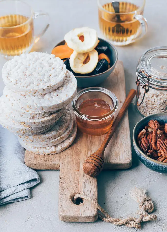 Verkruimel de rijstwafels in stukjes van ongeveer 1,5 centimeter boven een mengkom. Snijd de tutti frutti in kleine stukjes en doe ze bij de rijstwafelstukjes. Hak de noten grof en meng ze door alle ingrediënten in de mengkom. Voeg de honing toe en schep alles goed door.