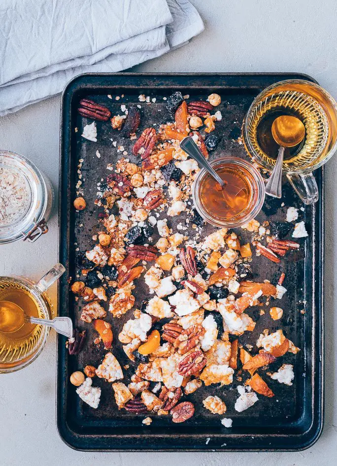 Verdeel het rijstwafel mengsel over de bakplaat zodat alles in een enkele laag ligt. Bak de granola in 20 minuten goudbruin, haal uit de oven en laat 10 minuten op de bakplaat afkoelen. Bewaar de snack granola in een pot of luchtdicht doosje en eet als tussendoortje of over je ontbijtje in de ochtend.
