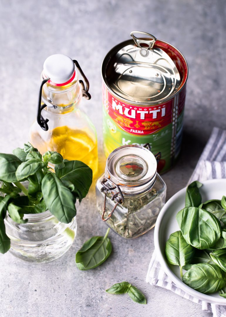 Haal de schil van de ui en knoflook en hak fijn. Haal de blaadjes basilicum van de steeltjes en houd ze apart. Snijd de steeltjes fijn. Verhit een scheutje olijfolie in een koekenpan en fruit de ui, fijngehakte steeltjes basilicum en 3/4 van de knoflook 2-3 minuten. Voeg de pomodorini en oregano toe, laat 15 minuten op laag vuur koken tot de tomaten tot een dikke saus zijn ingedikt. Breng op smaak met peper en zout.