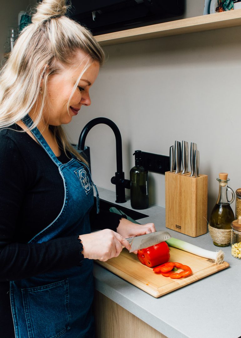 Als je een paprika snijdt, snij dan eerst de boven- en onderkant eraf. Dan snijd je de paprika aan 1 kant open en snijd je zo alle zaadlijsten eruit. Heel eenvoudig, snel en lekker no waste! Wist je dat je knoflook heel gemakkelijk en snel fijn kunt hakken door met een koksmes de knoflook eerst te pletten? Dan haal je het schilletje eenvoudig los en hak je de knoflook fijn in een handomdraai.