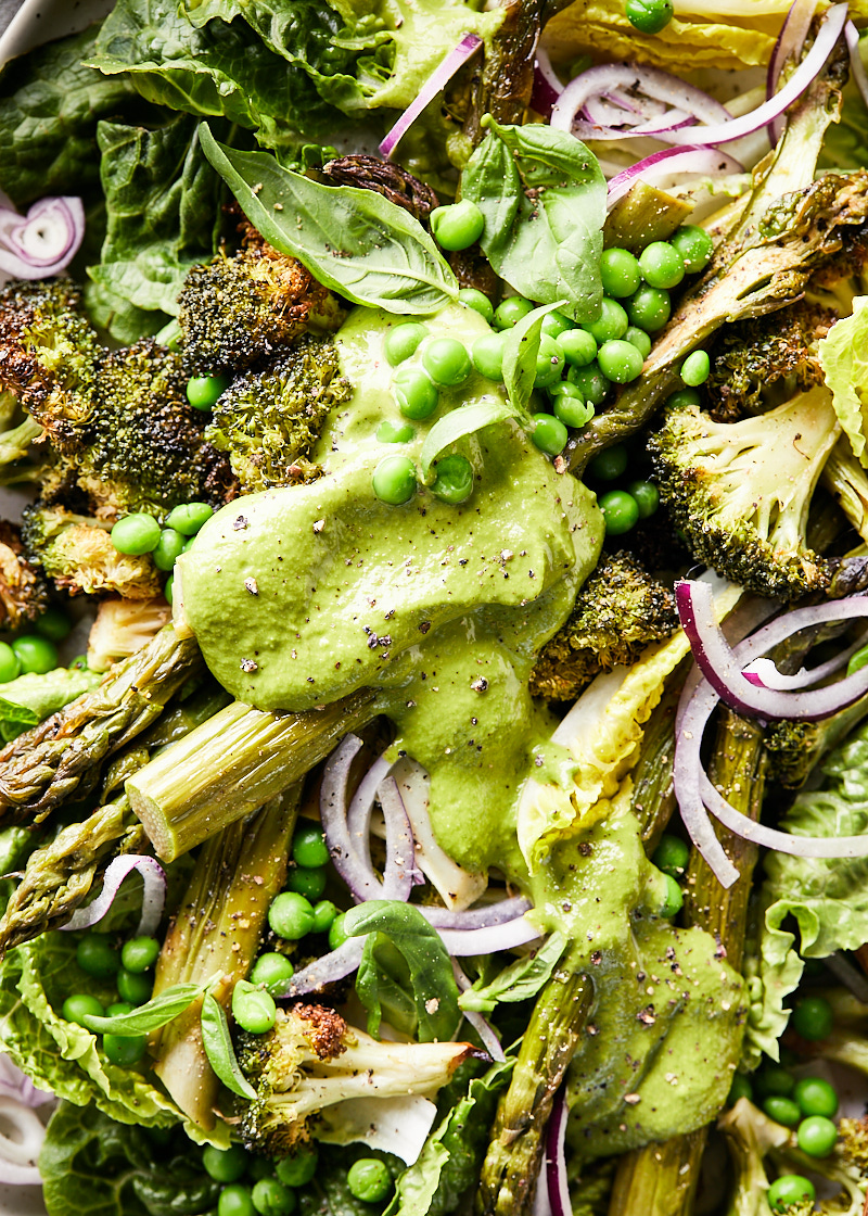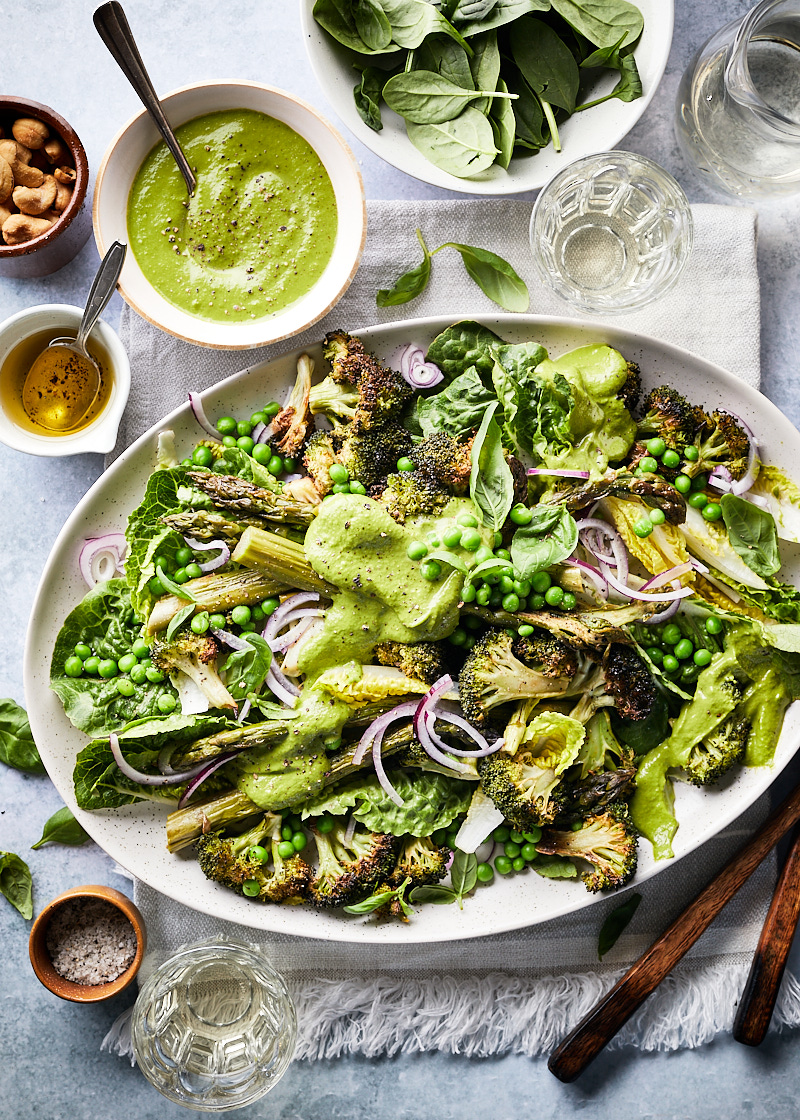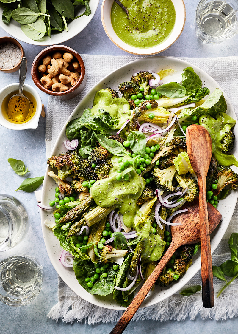De geroosterde broccoli en asperges geven de salade iets warms en hartigs, terwijl de little gem, doperwten en basilicum zorgen voor frisheid. En die Green Goddess dressing… daar blijf je van lepelen.